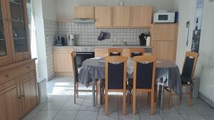 Die geräumige Wohnküche ist der zentrale Treffpunkt des Hauses. Von dort können Sie direkt zur Terrasse und der Liegewiese. Die Küchenzeile ist mit einer Spülmaschine, Mikrowelle, sowie einer Kühl- Gefrierkombination ausgestattet. Am großen Esstisch finden alle Platz. In der Wohnecke steht eine bequeme, ausreichend große Sitzgruppe, sowie ein Flachbildschirmfernseher mit Satellitenanschluss und eine Stereoanlage.