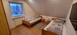 Im Obergeschoss befinden sich zwei geräumige Schlafzimmer. Ein Schlafzimmer mit zwei Einzelbetten ist in Kiefer eingerichtet, ideal als Kinderzimmer. Im zweiten Schlafzimmer befinden sich ein Doppel- und ein Kinderbett.